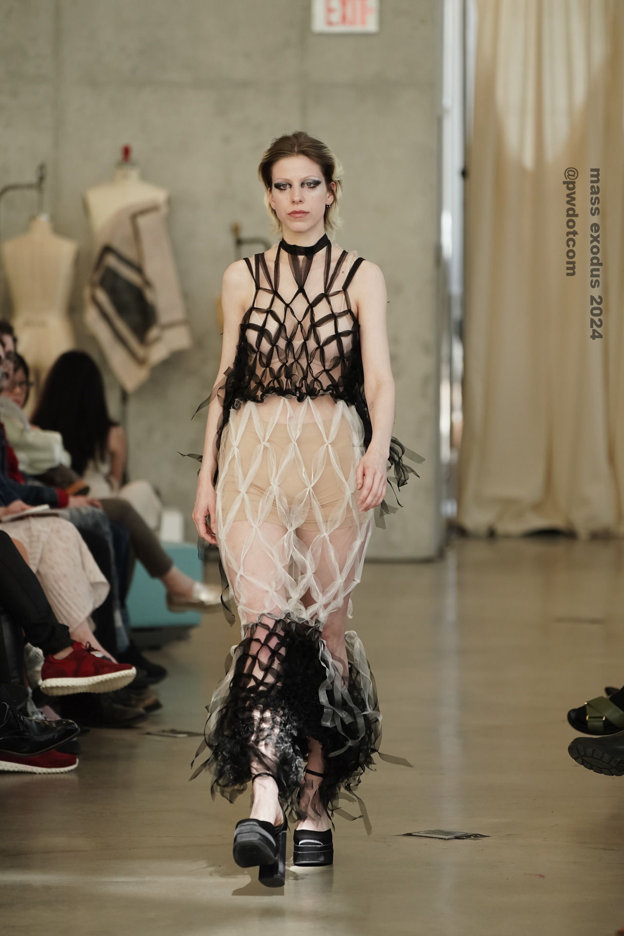 Celebrating its 35th anniversary, Mass Exodus stands as one of the largest student-run events in Canada. This hallmark occasion took place at the Sheldon and Tracy Levy Student Center at Toronto Metropolitan University. The showcase features three dynamic runway shows that display the inventive work of graduating fashion students. Mass Exodus is a true collaborative effort, meticulously organized by students across disciplines, encompassing everything from planning and marketing to audio-visual production and event management. The event attracts a diverse audience of industry professionals, artists, designers, academics, and fellow students, providing fourth-year fashion students with a unique and special opportunity to present their creations and share their visions with a wide and engaged audience. With full creative freedom, students use their garments as a means of self-expression, pushing boundaries and showcasing their unique perspectives on fashion and design.